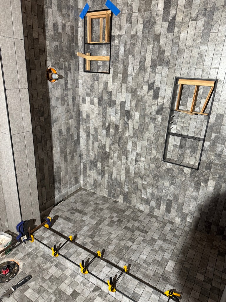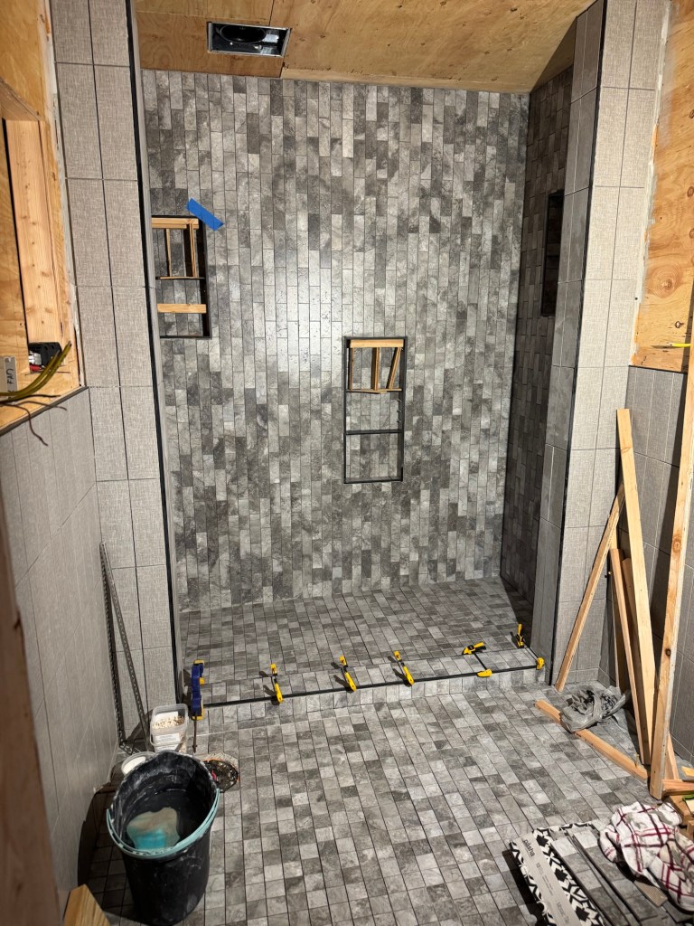 Saturday Mr Rainman came out and we finished up the installing the last of the tile. All of the tile is officially laid/installed on the walls/floors. Now we will need to ensure all of the grout lines are clear and ready for grout. We will wash the tiles a few times to get any residue of mud off of them. The grout is 100% epoxy based and only has a work time of 80 minutes. We are going to start on the tile walls in the main part of the bathroom. The walls were the cabinet and vanity will be installed. These are great locations to practice technique. I will need to watch some videos on using this specific brand of grout to see if there any pearls of wisdom needed to make the job easier.