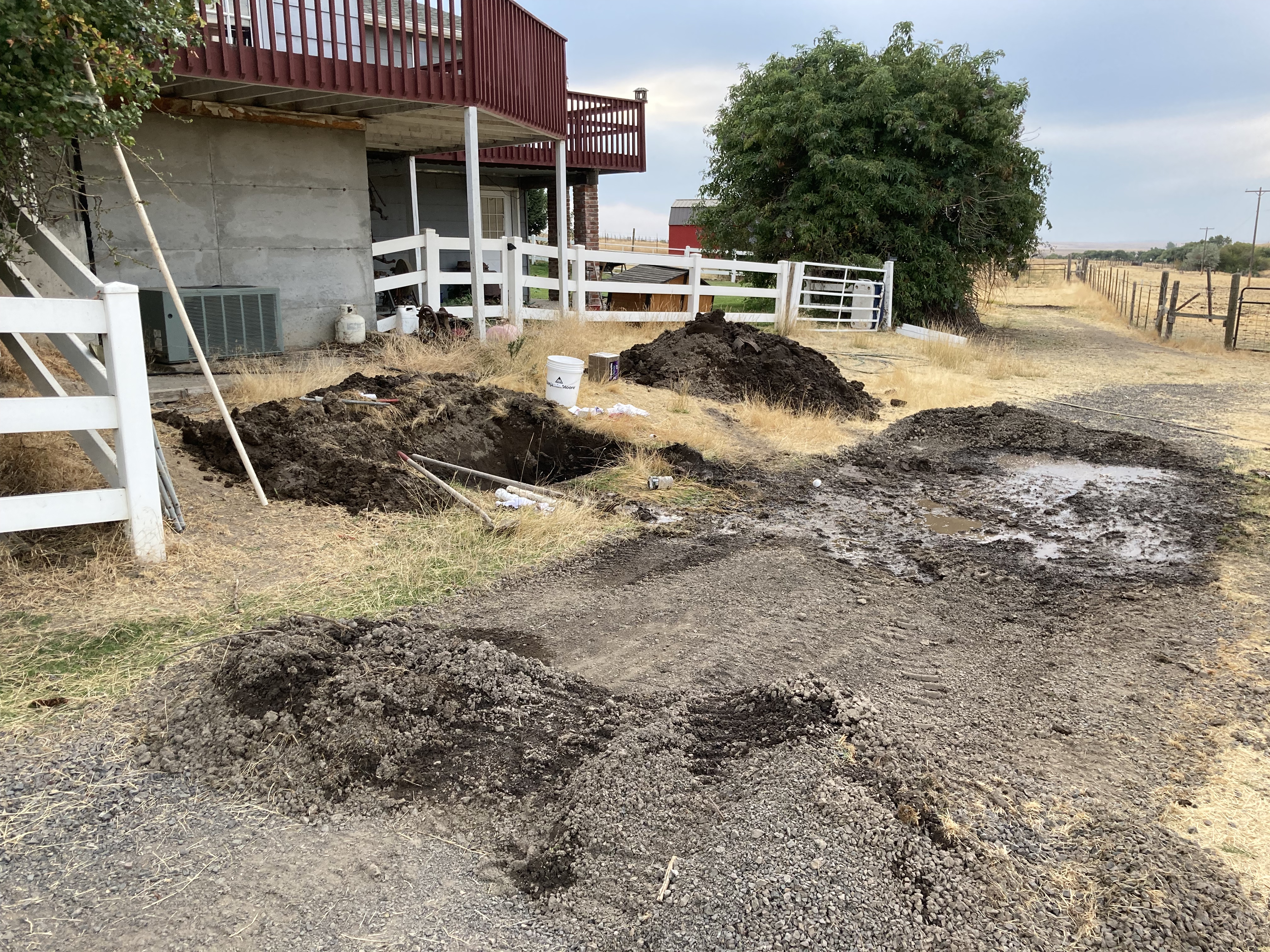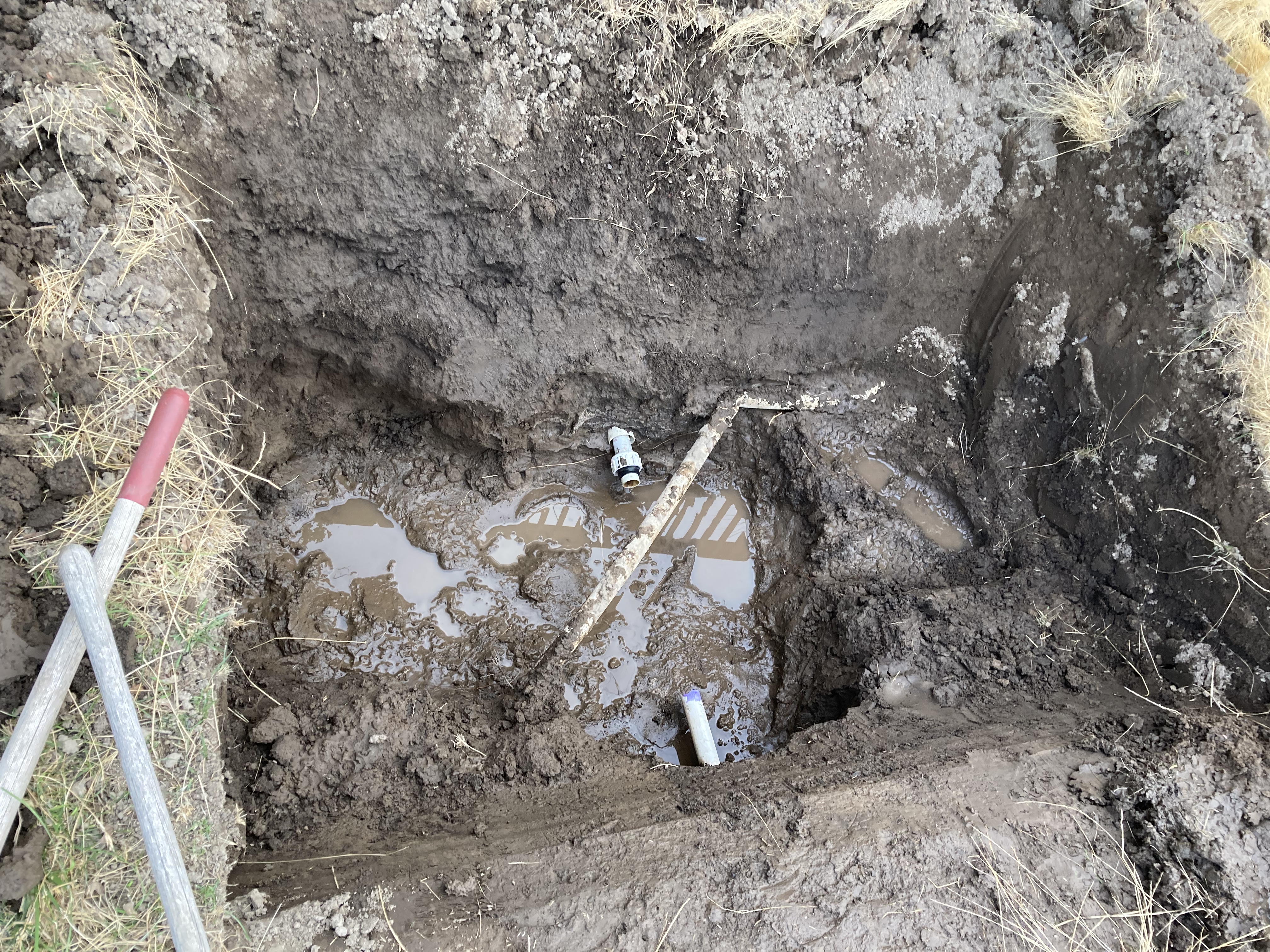 It turns out the slip joint had broken. This is the second time this has happened. I think it is from over tightening the joint. We dug it out then went to town and got the parts to fix it. I made Mr Professional do the actual gluing. I cut all the pipe and got it all ready. No matter what I do I usually have to glue everything twice. Once the parts were glued in we left it unpressurized to dry and cure.