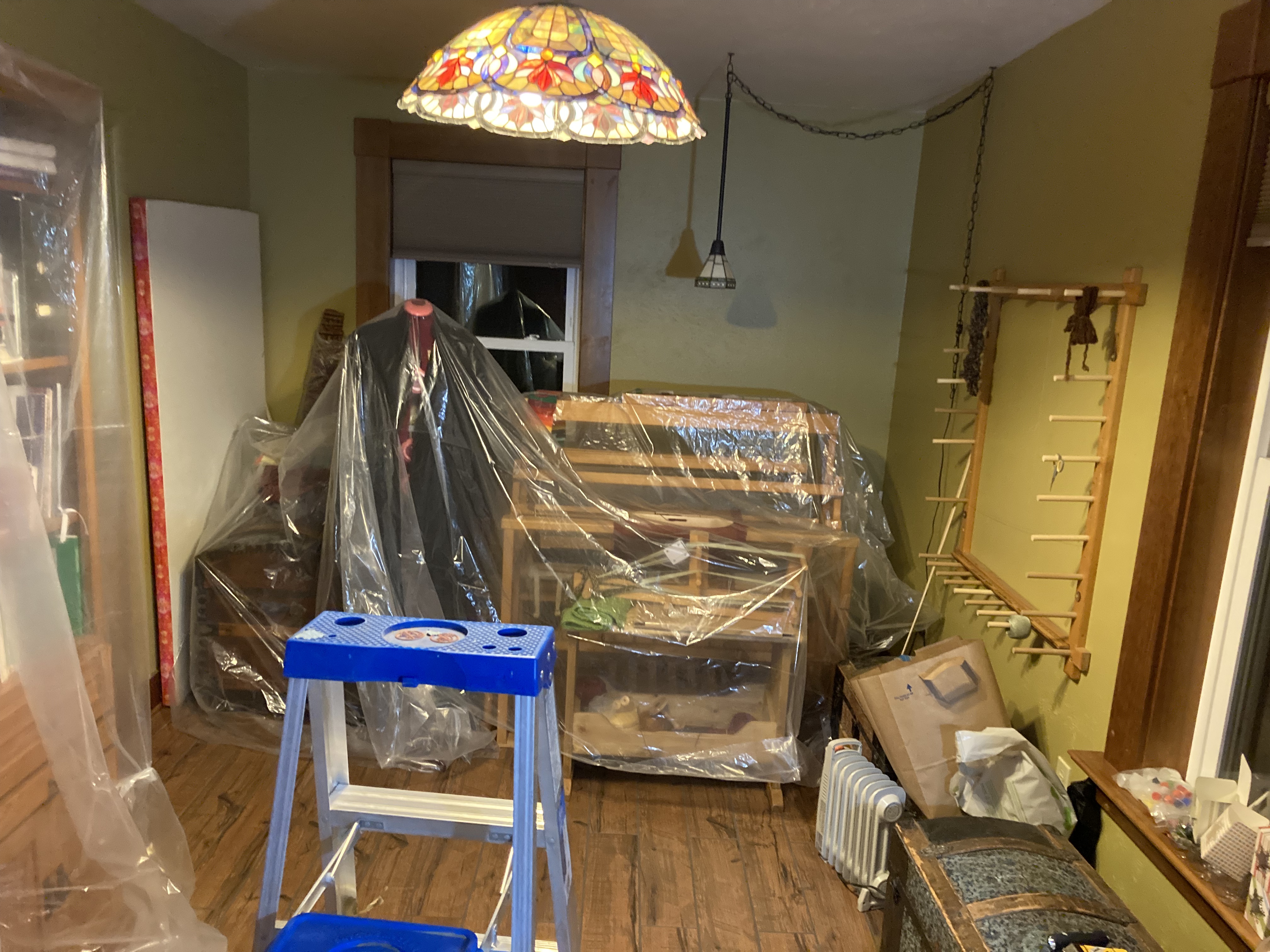 I went out to the old house and brought in a big roll of plastic and draped all three big items in the room then cut open the ceiling. I had to tear out about a four foot hole to see where the leak was coming from and the sheetrock was wasted, too water logged to allow to dry out and reuse. Once I had a large enough hole I could see that it was not the condensate drain line. I would have put money on that being the cause of the leak. I went back upstairs into the closet where the sump pump was located and realized that the rubber drain hose had been knocked out of the drain hole and was draining out onto the floor and down onto the ceiling below. This must have happened this summer when they worked on the heating/cooling system. It had a refrigerant leak that they fixed, someone’s foot must have slid the pump 1.5” away, knocking the drain hose out of place. We never noticed. So I moved the black rubber drain hose so it was pinned in place better and cut two boards to go behind the sump pump so no one could accidentally move it with their foot. I set up a portable heater in the room and we have been drying out the sheetrock ever since.
