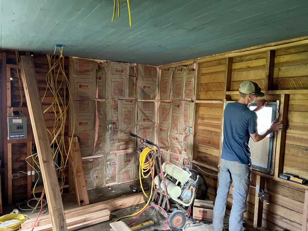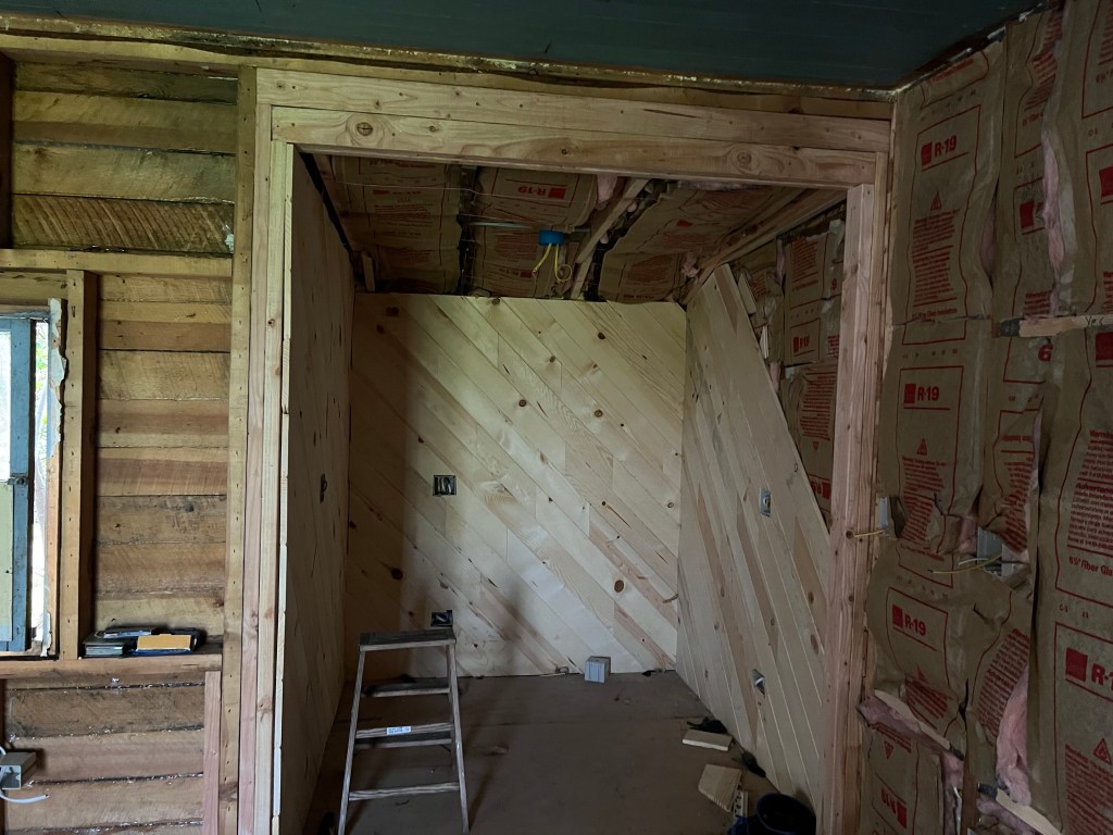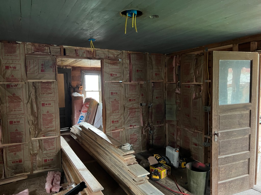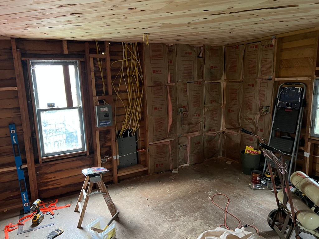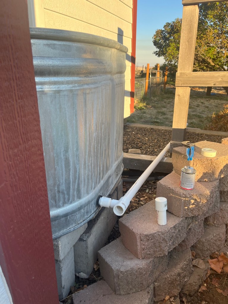 I plan on moving most of the tool storage from the old house out to the old chicken coop. Most of those tools and supplies are super specialized and I have them all sorted into separate bins. This way you can just grab a specific bin type for the needed job type. I only do tile work occasionally, same with painting supplies. I am also going to sort out most of my corded tools and give them away. They work just fine but I use battery powered almost exclusively now. It is so convenient when I am out and about on the farm. He also got the back drainage tank set up with a drain. This sits under the roof valley and catches the water and ice as it comes off our roof. We split the drain pipe in hopes that it would not freeze up this winter and crack.